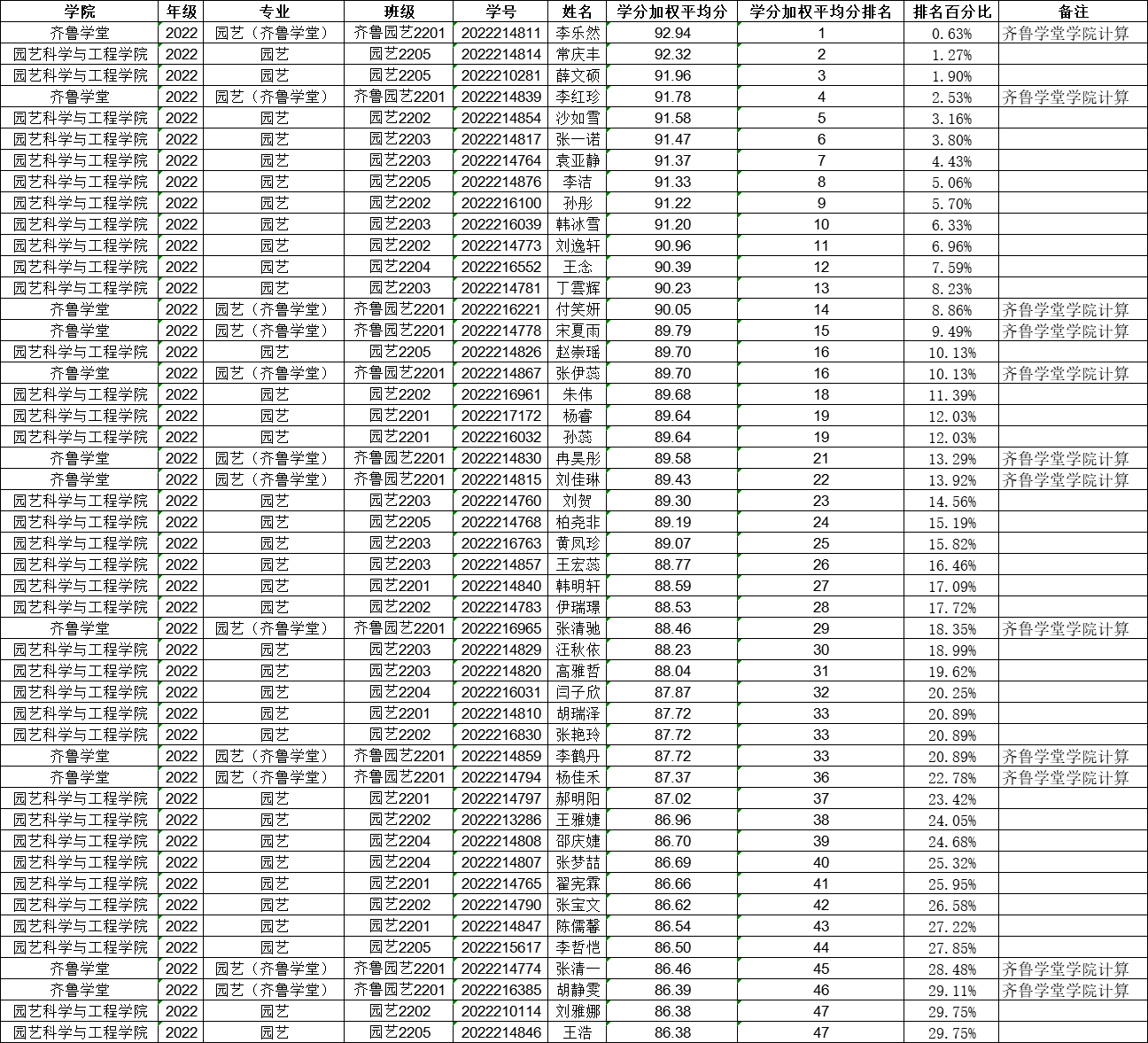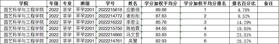 六、各专业学分加权平均分排名及排名百分比(学分加权平均分前30%)